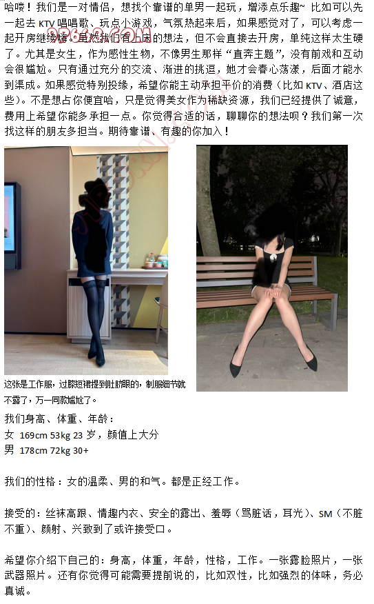 原本对找优质单男没抱太大希望,我和女友交往三年,之前从未尝试过这种玩法,主要是因为兴趣不大。这次突发奇想,受到一些多人视频的启发,决定试试看。在91社区的帖子下找到几个带QQ号签名的单男,为了高效沟通并展现诚意,我特地制作了一份简单的交友卡片,介绍了我们的基本情况和交友目的。发了四份卡片,收到三份“装备照”,外加一个闪图。在平板上给女友看了三个武器后,她对其中一位“大蘑菇”表示了兴趣,觉得形状不错,虽然她笑着说肯定没我的大。我们简单聊了几句,约好第二天在KTV见面。